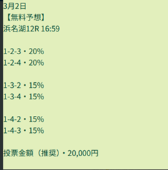 | 03/02 浜名湖12R | 3連単6点 | 的中(¥690) |