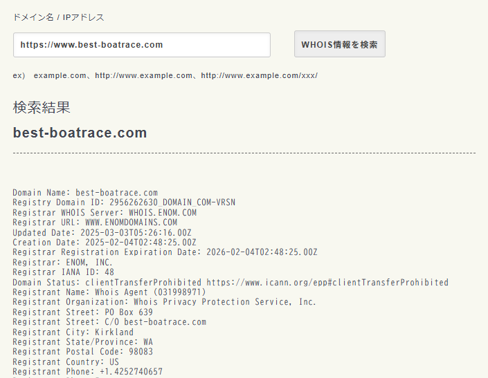 競艇予想サイト「ボートレースパレード」のドメイン情報を確認したところ、ドメイン名は「BEST-BOATRACE.COM」で、2025年2月4日に取得されています。このドメイン情報は、国の指定機関が管理しているため、第三者による改ざんは不可能です。