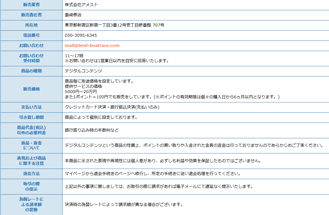 競艇予想サイト「ボートレースパレード」の信頼性を判断するうえで、まず確認すべきは特定商取引法に基づく表記です。