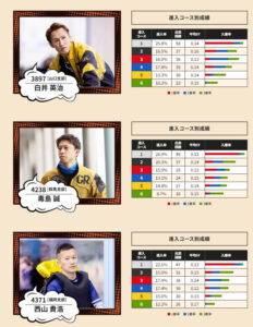 干満の差も激しいので、スタートは意外に難しいと言われているので、前半はよく徳山ボートレース場を走ることが多い、中国、九州地方の選手から狙え。