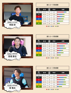 枠番は前日に決まります。両日共に1号艇になった選手が軸になる。徳山ボートレース場なのでスタート遅れがなければ逃げるだろう。連争いの軸は3号艇になる選手がまくりで攻めるのか、まくり差しで攻めるのかで変わってくるが基本は3号艇も入ってくる確率が高い。