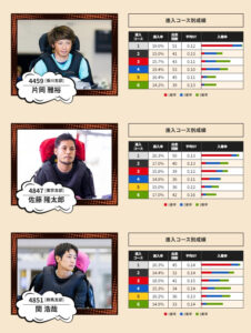 桑原悠選手、佐藤大佑選手が優勝した、抜群の実績を誇るエース機。周回タイムが特に速く回り足にエンジンだ。各選手の高い1着率、2連率が示すように出足と回り足の良さで、道中での逆転や粘り込みが効く。SG級の選手が乗れば、初日から信頼でき、機力を活かせる。積極的に狙うべきだ。