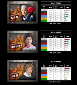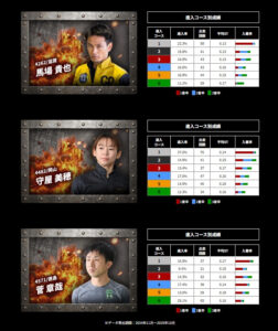 1コース1着率が58.3%、3連対率も80.3%とそこまで高くない。イン逃げ時の差し追走は多いが、差しが決まり、2コースの1着が低いのは要注意だ。3〜5コースが1着時はまくり、まくり差しの傾向が高く、1コースの残りが多い。6コースも他場と同じくらいなので、基本的にはあって、3着まで。