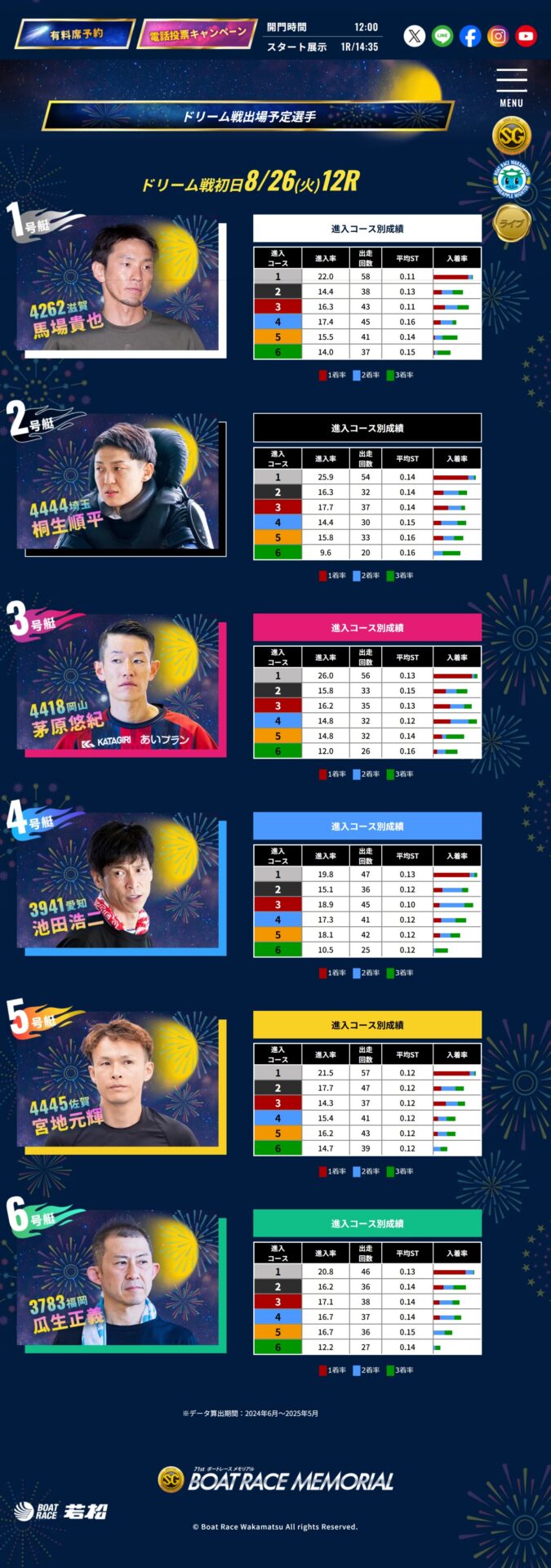 出典:ドリーム戦出場予定選手|SG第71回ボートレースメモリアル 特設サイト|ボートレース若松