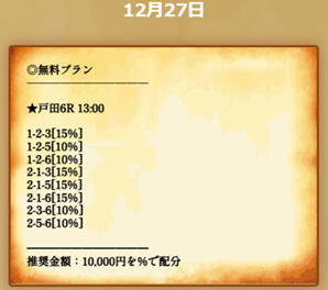 | 12/27 戸田6R | 2-1-5(¥1,570) |