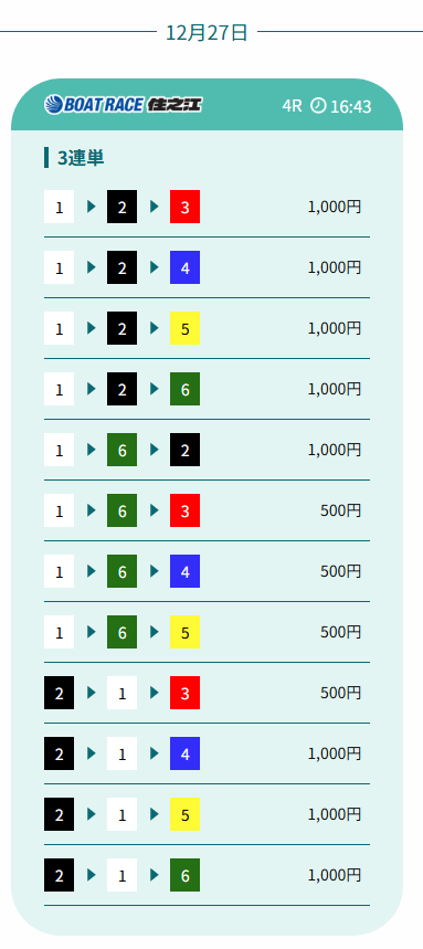 高配当を狙う構成ではないものの、的中率を意識した組み立てが多く、資金を大きく減らしにくい内容と言えます。