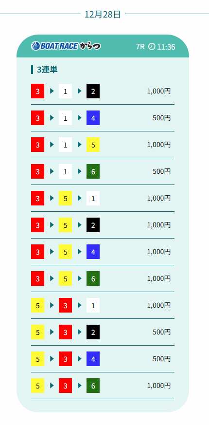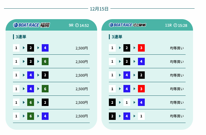 これらの結果から、単発狙いではなく、2レースを通じて資金を伸ばす設計が機能していることがうかがえます。高配当を狙いながらも無理に1点勝負に寄らない点は、再現性を重視するユーザーにとって評価できる要素と言えるでしょう。