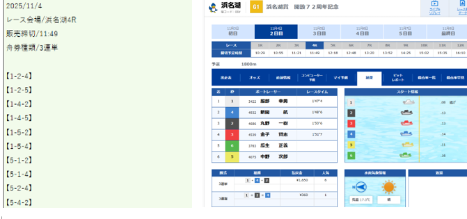 | 11/04 | 浜名湖4R | 的中:1-4-2 | ¥1,650 |
