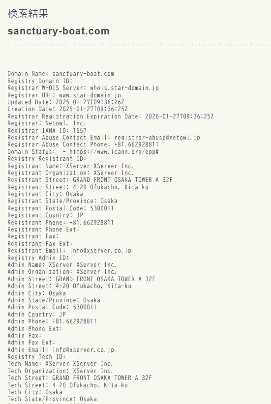サンクチュアリボートのドメイン情報を確認すると、登録は国の機関で管理されており、第三者による捏造は不可能です。