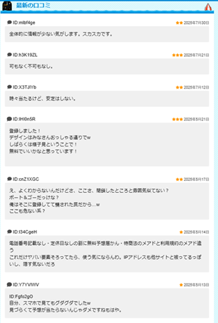 サイトに掲載されている情報は、ユーザーの期待を煽るような抽象的かつ誇大な表現ばかりで、具体的な的中実績や根拠となるデータはほとんど見られません。そのため、無料予想の質についても「精度が低い」「信頼できない」と評価されています。